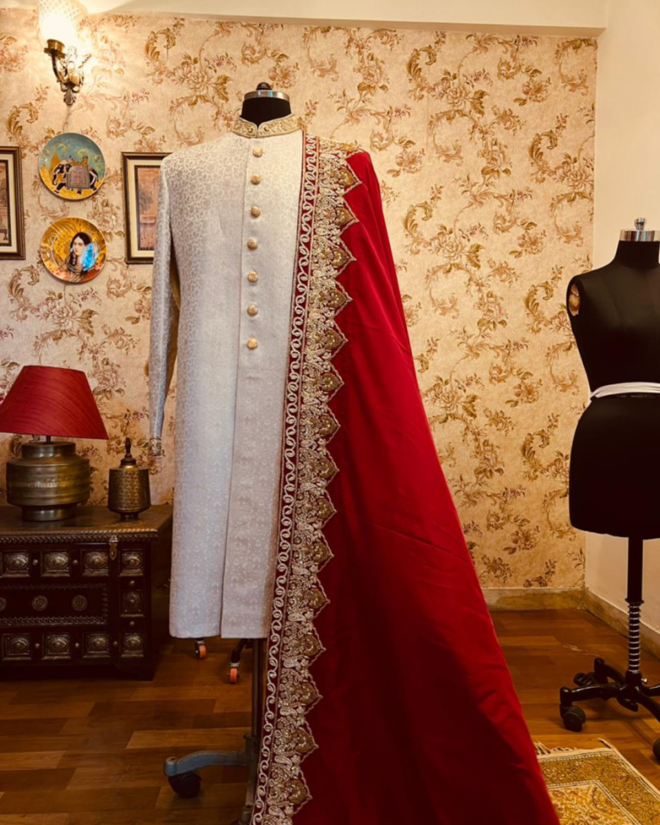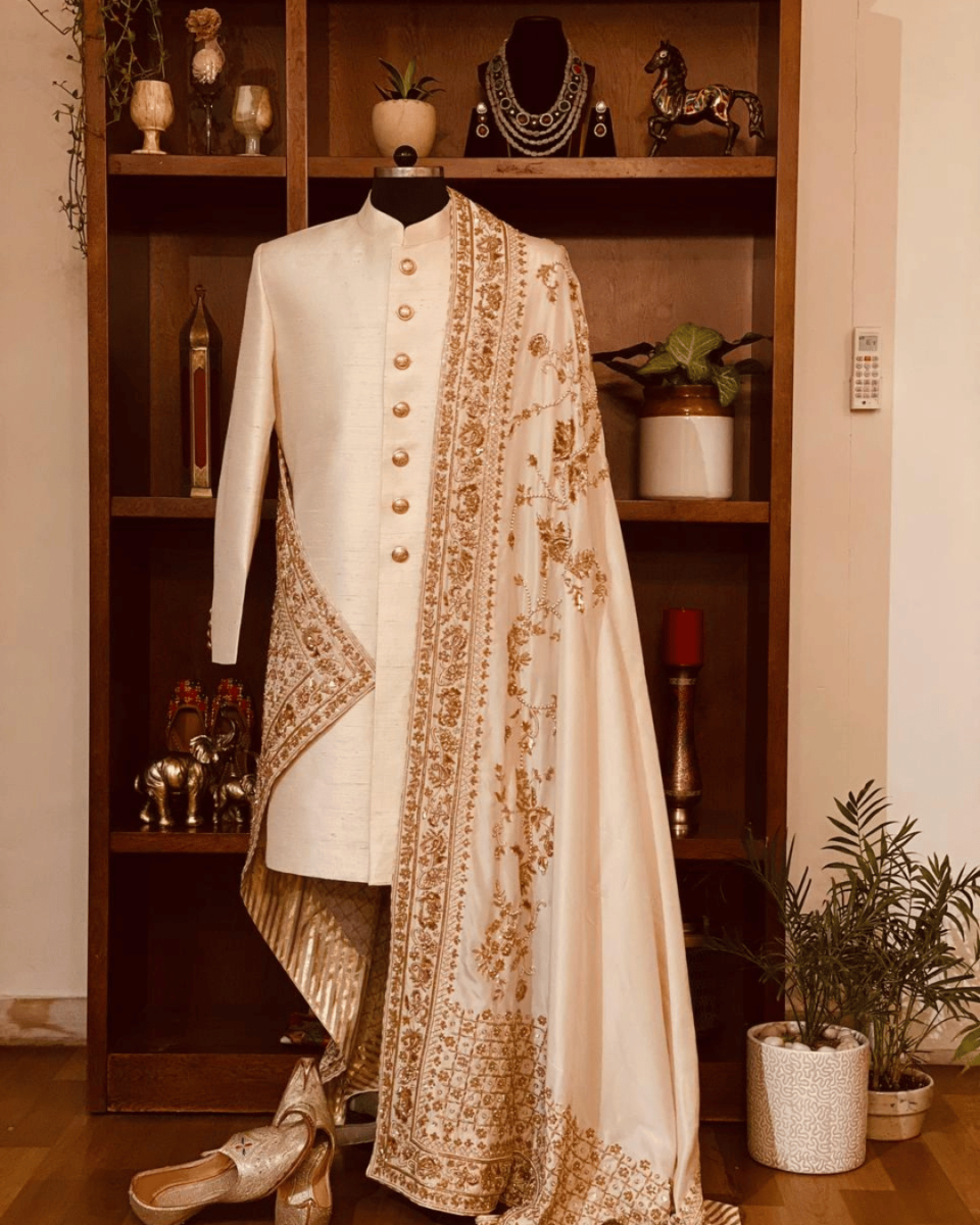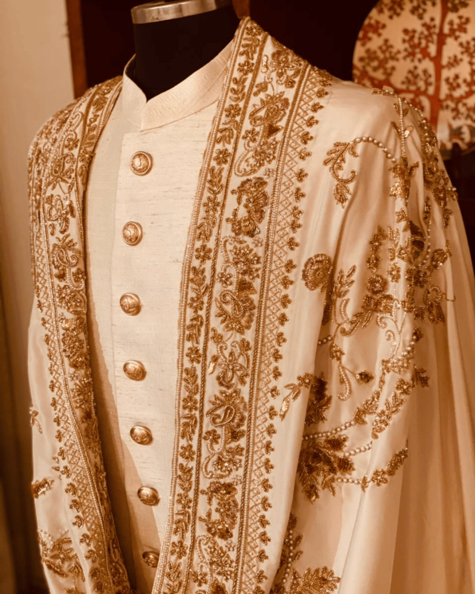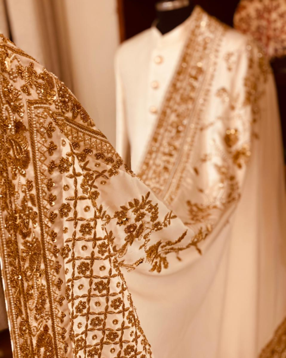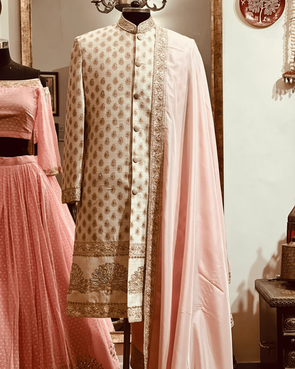 At the heart of the room, an ivory brocade sherwani lay stretched across a table. Golden threads traced intricate arches, and tiny peacock motifs shimmered with accents of emerald green. Each stitch carried the weight of history, the whispers of Punjab’s heritage.