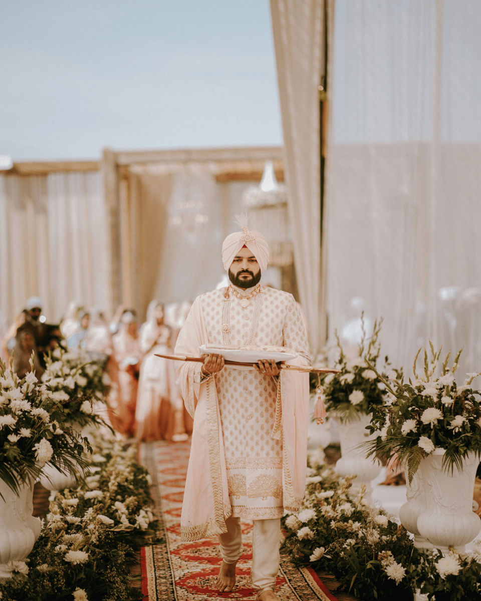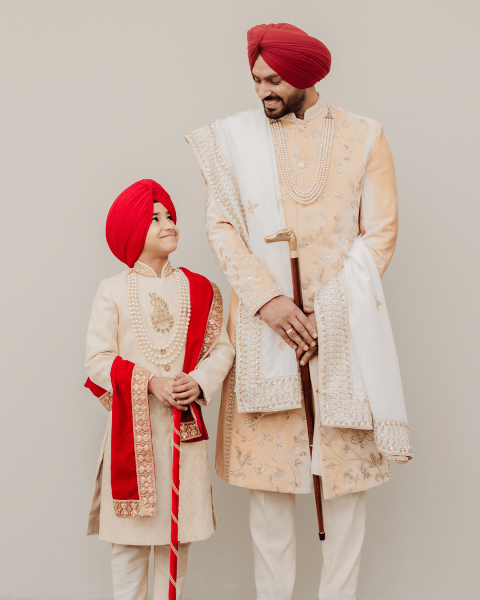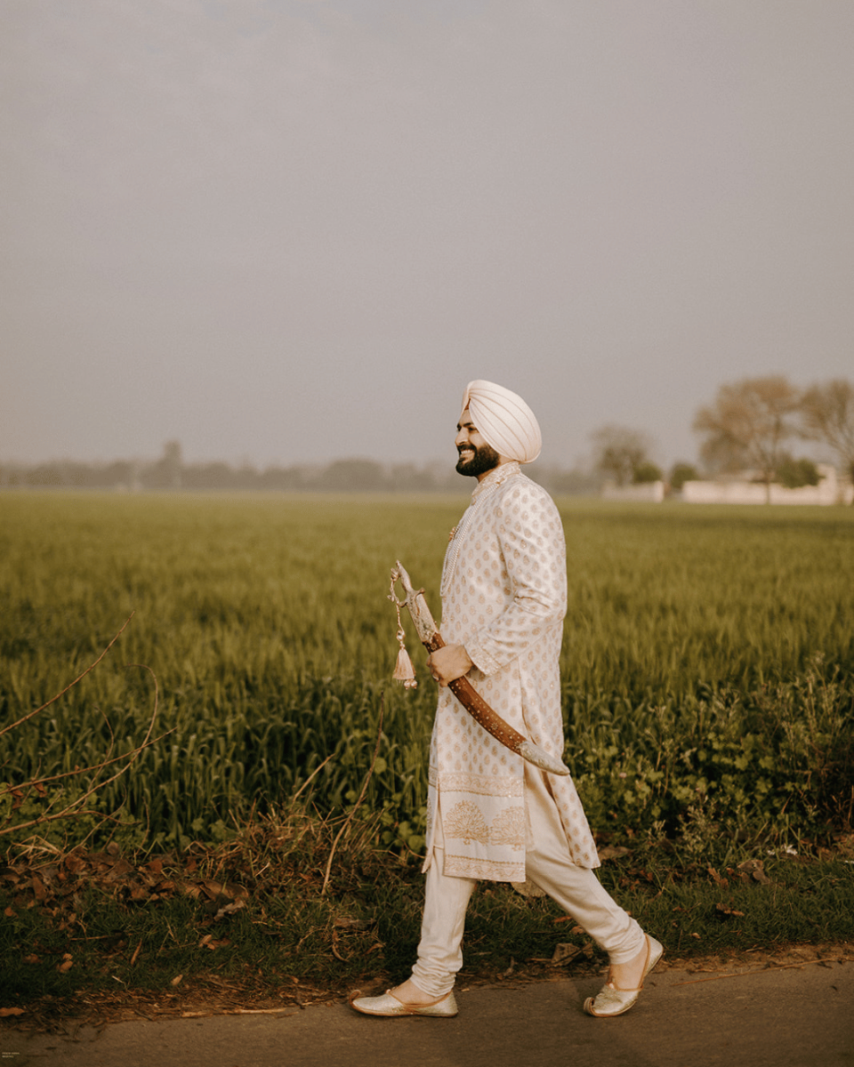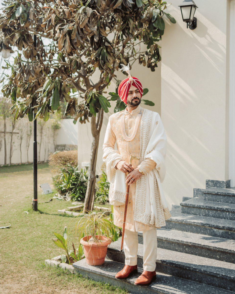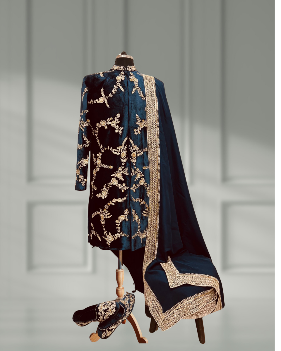 At the heart of the room, an ivory brocade sherwani lay stretched across a table. Golden threads traced intricate arches, and tiny peacock motifs shimmered with accents of emerald green. Each stitch carried the weight of history, the whispers of Punjab’s heritage.